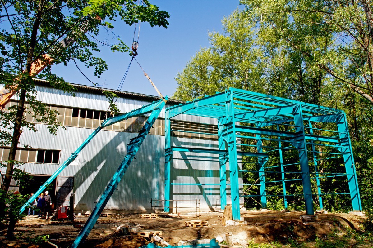 Складская пристройка к производственному зданию. Металлокаркас из сварной балки переменного сечения с подкрановыми путями под кран-балку грузоподъемностью 10тн. г.Воскресенск.